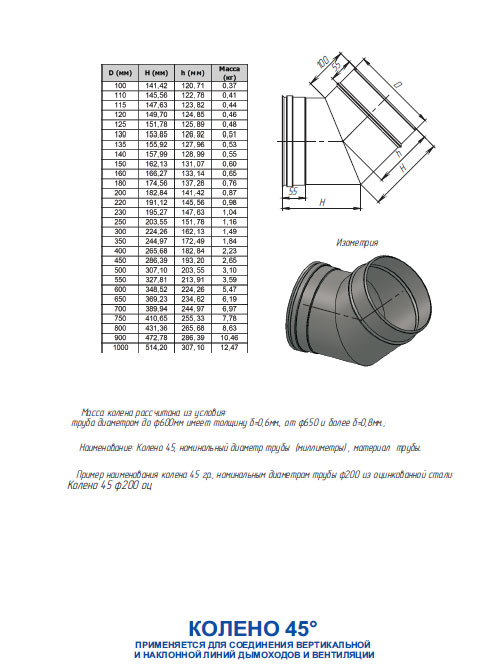 Коліно димохідне утеплене 45° складається з двох зварених між собою частин труби під кутом 45°. Дає змогу змінювати напрямок димоходу на кут 45°. Встановлюється як на вертикальних, так і на горизонтальних ділянках димоходу. Коліно не має нести на собі навантаження (вага димоходу), а лише виконувати функції повороту. З'єднується з елементами системи димоходу без додаткових кріплень: "труба в трубу".